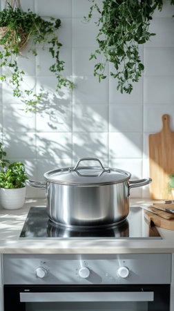 A stainless steel pot sits on a modern kitchen stove, surrounded by fresh herbs and chopped vegetables. Green plants add vitality to the kitchen, promoting a healthy cooking environment.
