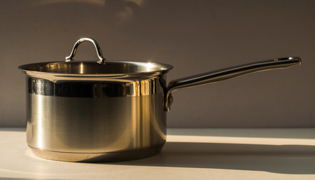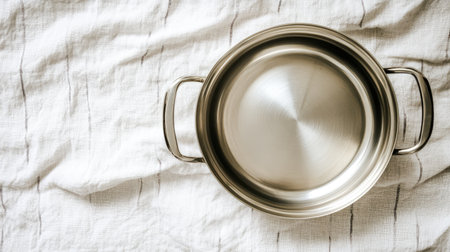 A clean stainless steel cooking pot rests on a textured linen fabric. The elegant design and modern look make it ideal for culinary presentations and food photography.