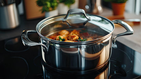 Close-up of a modern pot with a glass lid, showing a delicious meal inside and a clean, organized kitchen environment -