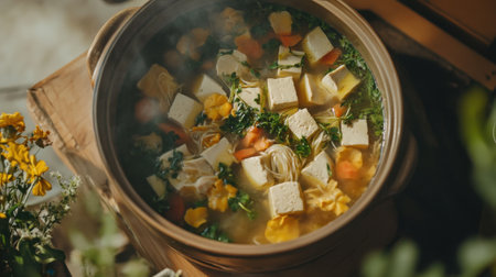 A delicious traditional Japanese hotpot featuring a variety of fresh vegetables and tofu, perfect for a cozy meal shared with family and friends.