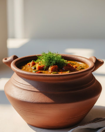 AI Generated. Rustic Brown Clay Pot of Flavorful Curry with Green Herb Garnish