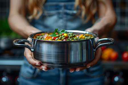A vibrant close-up of a person holding a stainless steel pot filled with a colorful mix of fresh, cooked vegetables, including peas, tomatoes, and other greens, emphasizing healthy home cooking and nutritious meal preparation.
