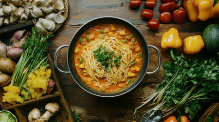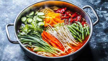 This colorful hot pot features a variety of fresh vegetables and noodles arranged beautifully. Ideal for food lovers and culinary enthusiasts.