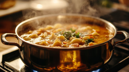 A detailed shot of a steaming pot of soup with fresh herbs and vegetables, showcasing the rich colors and textures of the cooking process in a well-lit kitchen.