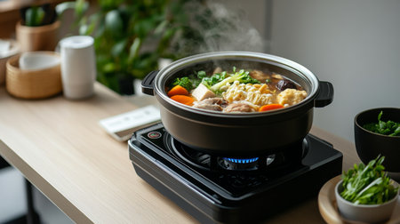 A modern kitchen setting with a high-quality hot pot on a portable stove, filled with rich broth and an assortment of ingredients, ready to be served.