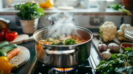 A vibrant vegetable soup simmers in a sleek pot, surrounded by fresh herbs and colorful ingredients, showcasing the art of home cooking in a cozy kitchen.