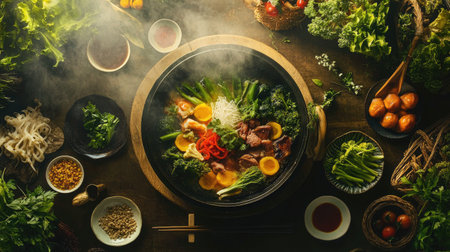 A vibrant display of a steaming pot filled with noodles and fresh herbs, surrounded by bowls of sauces and ingredients, showcasing the richness of Asian cuisine.