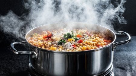 A vibrant scene in a modern kitchen featuring fresh vegetables cooking in a stainless steel pot. The steam rising creates a warm, inviting atmosphere perfect for cooking enthusiasts.