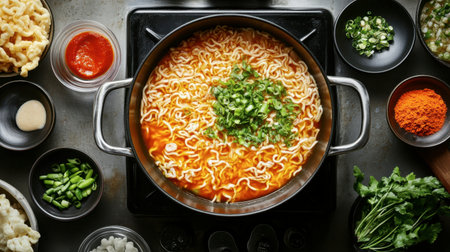 An overhead shot of a stove with a pot of boiling instant noodles, surrounded by bowls of garnishes and sauces.
