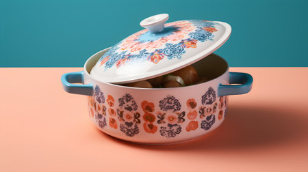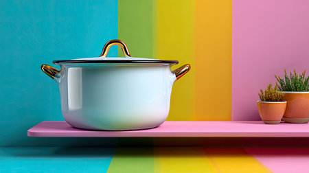 A vibrant still life featuring a white enamel pot on a colorful shelf. Bright backgrounds complement potted plants, ideal for kitchen decor or culinary inspiration.