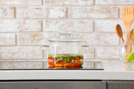 Metal pot with fresh vegetables on induction cooker. Modern kitchen or healthy food concept.