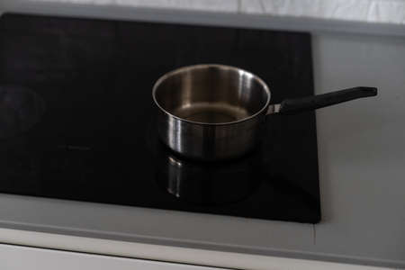 A metal pot on an electric induction cooker in a modern kitchen. Copy space.