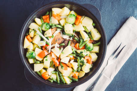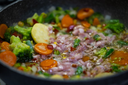 Frying pan with vegetables and meat, close-up. Selective focus.