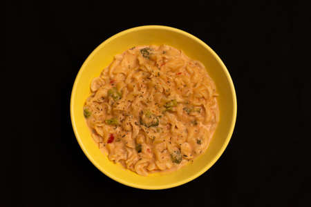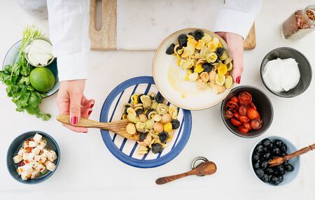 Traditional Cold Italian Pasta salad. Orecchiette Arlecchino, roasted tomatoes, onion, black olives, lime, feta cheese, olive oil, spices and herbs. Cooking process. Top view.