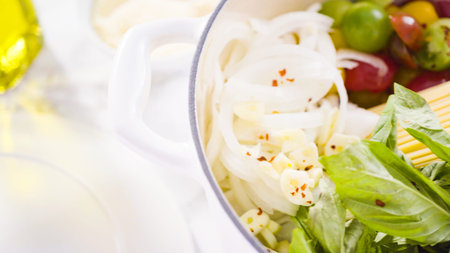 Step by step. Cooking on pot pasta recipe in an enameled cast iron dutch oven.