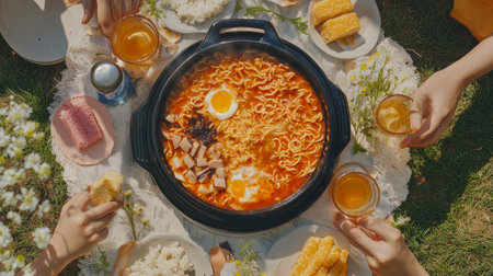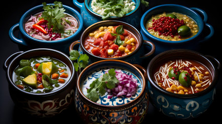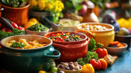 An overhead view of a table laden with a delicious variety of food, showing the textures and colors of a delightful meal. The centerpiece is a colorful dish with vibrant hues of red, orange, and green, surrounded by an array of tempting appetizers, breads, and sauces. A rustic wooden table and soft lighting enhance the allure of this culinary feast.
