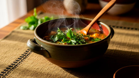 healthy plant-based food recipes concept, vegan lentil soup with caulini and broccolini and vegan cream cheese topping