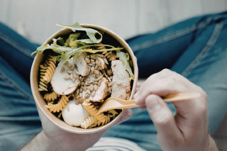 A person eating a nutritious meal from a bowl with a fork, containing pasta, chicken, and greens.
