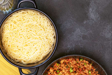 Bowls with ingredients for balanced one pan meal with beans, minced meat, rice and various cut vegetables and cooking pot with spoon on gray background, top view