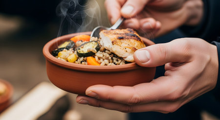 Traditional Moroccan tagine with lamb, vegetables, and nuts served with a fresh side salad. Highlights vibrant Mediterranean flavors and culinary artistry.