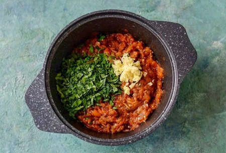 Pour in vinegar, salt and pepper. Add chopped garlic and chopped herbs. Simmer for another 10-15 minutes.
