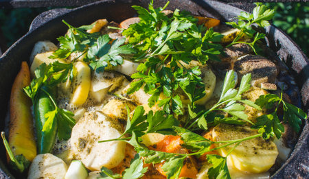 background stewed potatoes with meat sprinkled with fresh herbs close up