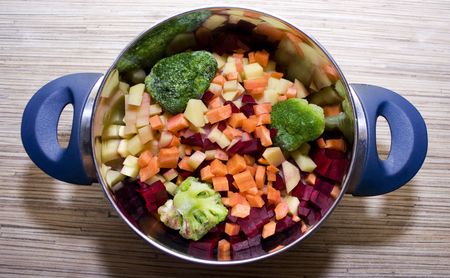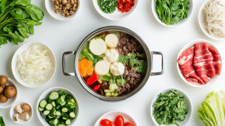 Upper view of a hot soup pot with meat and vegetables and a metallic bucket