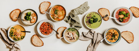 Flat-lay of vegetarian creamy homemade soup with bread slices over white plain table background, top view. Autumn and Winter creamy vegan soups, fall and winter vegetarian food menu concept