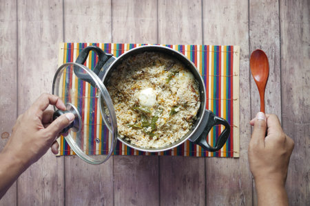 Cropped shot of female eating Thai traditional food, Stir fried minced pork with basil (Pad ka prao) on black table in Thai restaurant