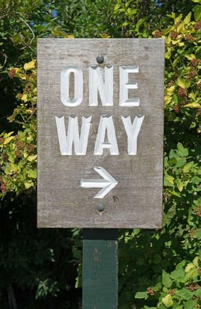 Bright white one way sign with an arrow on a wood post in a park like setting.