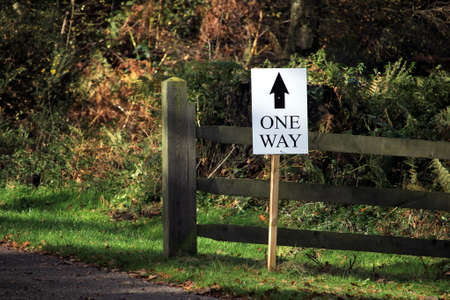 Wooden gate on a road through forest or woodland, with a sign saying ONE WAY