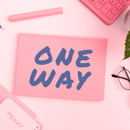 Writing displaying text One Way. Concept meaning Only direction Street sign Traffic regulation route indication