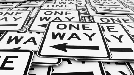 Large aligned pile of left point one way traffic signs. This image is a 3d illustration.