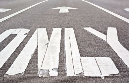 This close-up image captures the word ONLY painted in white on a textured asphalt surface, emphasizing road markings. The blurred background provides an urban context, highlighting the significance of directional signs in everyday life.