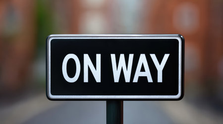 A directional sign states On Way, set against a blurred urban backdrop, perfect for conveying navigation themes and urban exploration concepts.