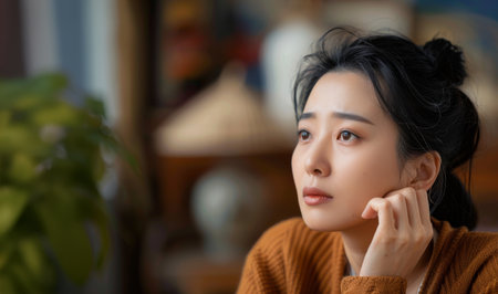 Portrait of sad and upset Asian woman sitting on the floor in the living room. Family problems, financial difficulties