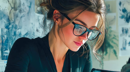A woman in glasses working at a desk, drawn in a comic or digital painting style.