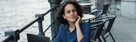 young freelancer using laptop while sitting on summer terrace near river in berlin, banner
