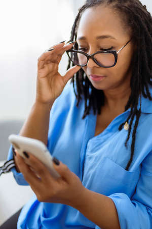Close-up view of businesswoman writing her schedule on smartphone in dark trendy workplace