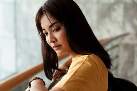 Asian girl looking at her mobile phone with serious expression in film tone colour style