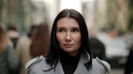 A young woman is looking at the camera. Beautiful girl with gathered hair in a jacket. A brunette in demi-season clothes and scarf is standing on the subway. Public transport. Street style