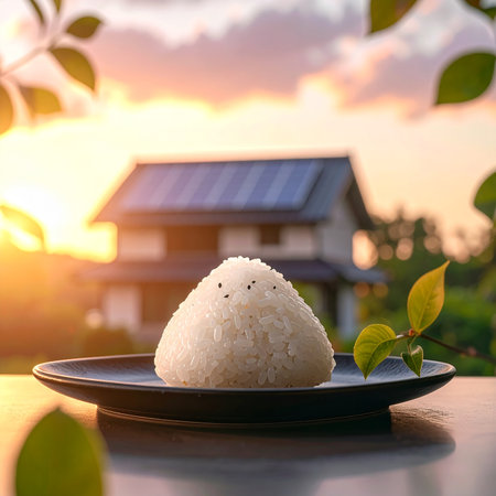 Triangular Japanese rice ball topped with sesame seeds on a dark plate with a house and sunset.