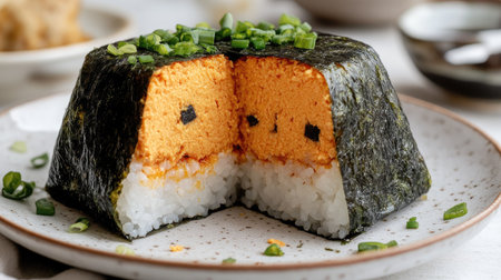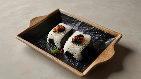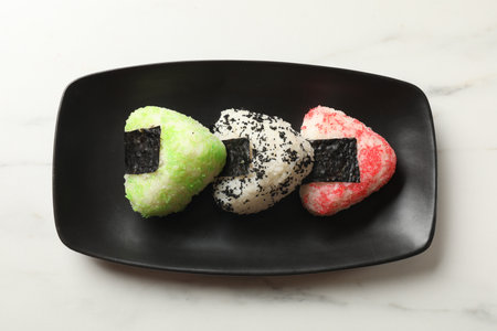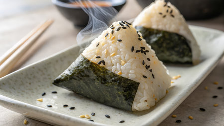 Traditional Japanese onigiri are displayed on a plate