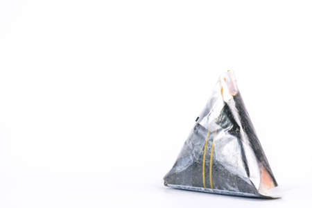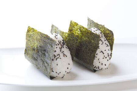 Portable Onigiri a Japanese rice ball wrapped with seaweed in sealed plastic on white background