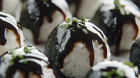 Indulge in a close-up view of exquisite sushi rolls, featuring a glossy sweet sauce and fresh green garnish. Perfect for food enthusiasts.