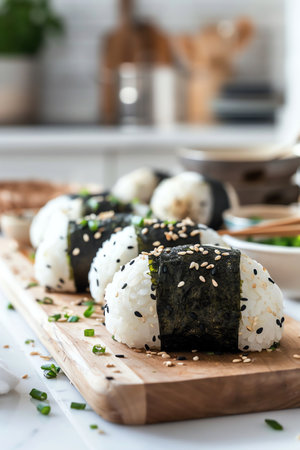 Traditional onigiri rice balls neatly arranged on a wooden platter, each wrapped with a strip of nori and garnished with sesame seeds, bright kitchen setting, eyelevel shot