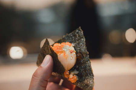 Scallop sashimi topping red salmon caviar put on seaweed sheet in hand ready to eat