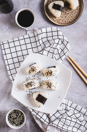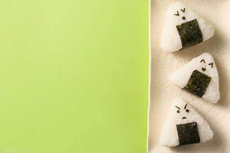 A series of shots of onigiri of various shapes and fillings on a plate. top view. Japanese rice ball.