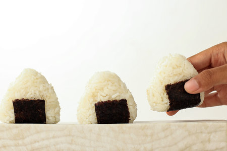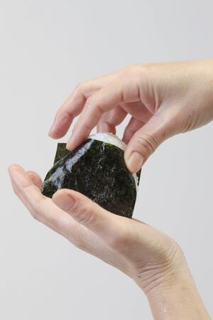 Female Hand Take Onigiri, Japanese Food, Japanese Rice Ball, Rice Triangle with Seaweed