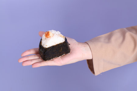 The Asian woman holding onigiri on purplr background.